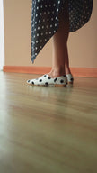 Producto finamente confeccionado en 100% LINO BELGA BLANCO CON LUNARES NEGROS, capellada en cabritilla, y suela de cuero. El valor agregado lo constituye el trabajo artesanal que cada pieza encierra. El calzado de AZHAR se caracteriza por su calidad, delicadeza y exquisitez. Las BABUS AZHAR son garantía de elegancia y bienestar.