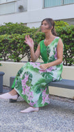 Sofisticación en cada detalle. Este exclusivo vestido de talle único fusiona la frescura del lino belga estampado en delicados motivos florales con la riqueza del shantung de seda en un vibrante tono verde. Un diseño único pensado para mujeres elegantes, de buen gusto y apasionadas por la moda atemporal. Perfecto para destacar con distinción y resaltar tu personalidad en cualquier ocasión especial.
